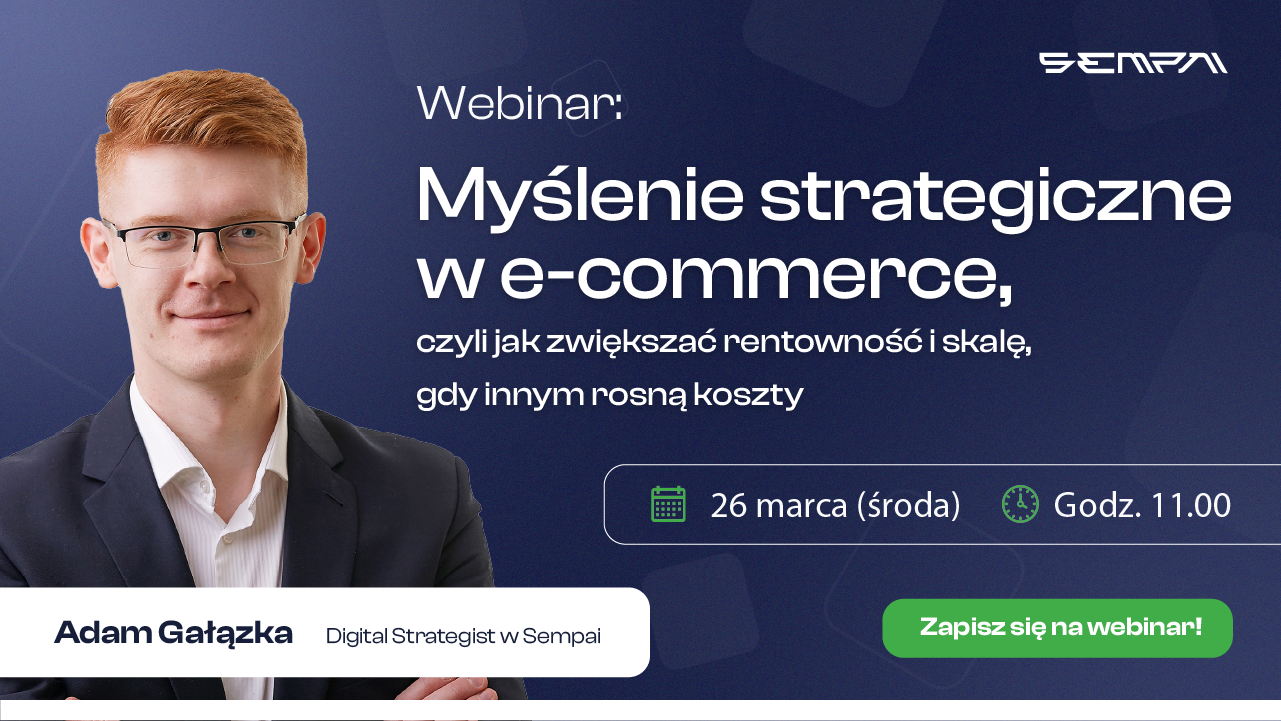 Myślenie strategiczne w e-commerce to klucz, aby rozwijać się, kiedy inni narzekają na rosnące koszty! Dowiedz się, jak to zrobić w praktyce od Adama Gałązki, doświadczonego stratega z 10-letnim stażem w e-commerce. Podczas webinaru poznasz: ✅ Jak dokładnie analizować rynek i konkurencję, by podejmować trafne decyzje. ✅ Sposoby generowania wartościowego ruchu i wykorzystywania potencjału marketing automation. ✅ Jak unikać błędów w pracy z agencjami i wykonawcami.